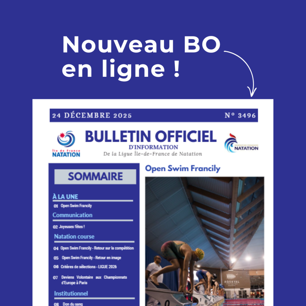 Clique ici pour lire le nouveau BO 3495 du mercredi 10 décembre 2026 ! La Ligue Île-de-France de Natation publie son Bulletin officiel n°3496 en date du 24 décembre 2025. Ce numéro revient notamment sur l’Open Swim Francily, met en lumière les performances...