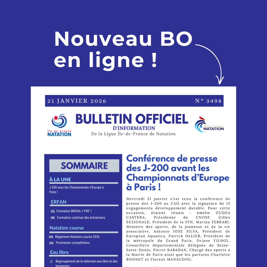 Le Bulletin Officiel n°3498 de la Ligue Île-de-France de Natation du 21 janvier 2026 est en ligne. Cliquez ici pour le lire !  Bonne lecture à tous !